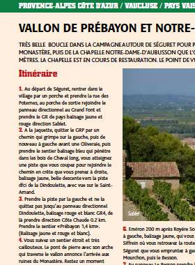 Très belle boucle dans la campagne autour de Séguret pour partir à la découverte du vallon de Prébayon et les ruines de son monastère, puis de la chapelle Notre-Dame-d’Aubusson que l’on atteint par une grimpette assez sportive, notamment sur les 250 derniers mètres. La chapelle est en cours de restauration. Le point de vue est splendide.